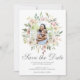 Un elegante marco circular de peonías de color rosa acuarela y rosas crema marfil enmarca esta encantadora invitación de foto para "Save the Date" de verano. Los ramitos botánicos de hojas de eucalipto verde salvia decoran en medio de la variedad de flores de durazno sobre la