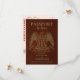 Estas lindas bodas, salvo las tarjetas de fecha, están diseñadas para que se vean como un pasaporte con un fondo de cuero falso naranja oxidado, un águila estadounidense y una huella dorada. La parte de atrás se parece a la parte interior del pasaporte con una foto y un lindo puerto de sellos de entrada que indican el destino de su boda. Excelente manera de que sus amigos y familiares sepan que la fecha está abierta para viajar a su boda.