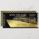Pase de abordaje de crucero salva la fecha ticket que presenta un fondo negro elegante, una silueta de barco de crucero de lámina de oro falsa elegante y una plantilla de texto elegante que es fácil de personalizar.
