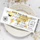 Invitación de entrada de boda con pase de embarque que incluye un elegante mapa del mundo de destino con lámina de oro, brújula, avión y una plantilla de texto personalizada.