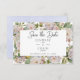 Esta sencilla pero elegante boda, salvo el diseño de la tarjeta de fecha, cuenta con un hermoso fondo hidrato floral de color rosa polvoriento, blues y perwinkle y violetas con vegetación. El texto se muestra en un fondo blanco arqueado y el diseño se completa con la primera inicial de la novia y el novio. Este diseño forma parte de la suite de tarjetas de boda rústico Pastel Hydrangea Floral Monograma. Creado por Simply Farmhouse Press.