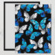 Patrón continuo realista de mariposas azules y blancas sobre fondo negro.