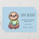 Tarjeta para guardar la fecha con una adorable ilustración de un perezoso feliz que lleva una camiseta verde.