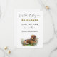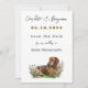 Plantilla de guardar la fecha con diseño de perro salchicha. Imagen de flores silvestres y Dachshund marrón en la parte inferior. Personalice para su evento de boda utilizando cinco líneas de texto en fuentes de escritura y de impresión en negro y verde marrón. Cambie fácilmente el color del texto en la herramienta de diseño, o pídame ayuda.