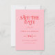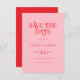 This pink and red typography wedding save the date card features a bold retro modern design. The soft pink background pairs with rich red text for a clean and eye-catching look. The typography is inspired by vintage styles while keeping a simple and modern layout.