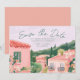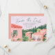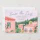 This destination wedding Save the date features painted artwork of a Mexican town scene with papel picado banners on top. All the important wedding details can be personalized. Colors include green, pink, white and coral.