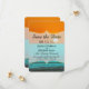 Tarjeta de compromiso con un diseño de hermoso amanecer naranja en la playa y agua de mar azul turquesa. Un diseño muy clásico y sofisticado para la pareja que se casa. Todo impreso en foto.