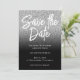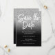 Superposición de arte digital con brillo gris plateado falso sobre negro para la información de "Save the Date" de tu boda.