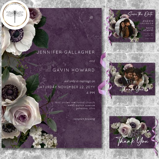 Esta exquisita boda salva la tarjeta de fecha con diseño fotográfico con un cautivador spray de lavanda pálida, anémonas y rosas blancos, verdes y de rosa pálido, artísticamente arreglado contra un lujoso fondo de ciruela oscura morada con un suave efecto marbleizado. La tipografía blanca limpia y moderna aporta un toque de elegancia, haciendo de este diseño la elección perfecta para un boda romántico y sofisticado. Tu foto favorita completa el aspecto. Creado por Simply Farmhouse Press.