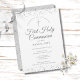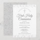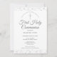 Una elegante invitación de Primera Comunión con delicado polvo de estrellas plateado. Puedes personalizar con los detalles de tu celebración especial en texto plateado elegante. Diseñado por Thisisnotme©