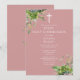 Esta elegante invitación de Primera Comunión en rosa polvo con vegetación de eucalipto botánico se puede personalizar con tu información en tipografía chic con iniciales de monograma en el reverso. Diseñado por Thisisnotme©