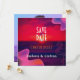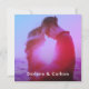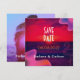 Una tarjeta moderna y vibrante de aviso de boda con puesta de sol púrpura que puedes personalizar con tu fotografía favorita. Este diseño atrevido y llamativo con toque tropical y tipografía chic hará que el anuncio de tu próxima boda destaque. Agrega tu foto en la parte trasera de la tarjeta y listo. Ten en cuenta que hemos agregado un filtro y una capa semitransparente a la foto de la plantilla para que coincida con la parte delantera de la tarjeta. Puedes eliminar fácilmente el filtro y ocultar la capa utilizando la función de edición.