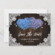 Romantic rustic purple and blue floral wedding save the date card featuring hydrangea flowers against a barn wood background adorned with white floral lace and twinkle lights.