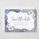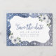 Faux brillante marco purpurina de plata y azul y "guardar la fecha" guión con floral azul y blanco polvoriento, elegante y elegante. Excelente salve la tarjeta de cita para boda moderno, boda romántico y bodas botánicas en el jardín. Vea todas las piezas coincidentes de la colección.
