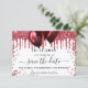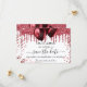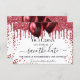 Un fondo blanco moda decorado con tonalidades rojas purpurinas goteando y globos. Personalice y agregue una fecha y un nombre/edad. El texto: Save the Date se escribe con un gran guión de estilo escrito a mano.