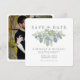 Una tarjeta de anuncio de fecha de salvación perfecta para el tema floral de suculentas de moda que es tan popular hoy en día. Un hermoso ramo de plantas suculentas en hermosos tonos de verde polvoriento, azul, gris y lavanda están inspirados en los colores impresionantes de estas increíbles pequeñas plantas. El texto suave gris-verdoso luce impresionante contra el fondo blanco crujiente. En la parte posterior, una foto de la novia y el novio está enmarcada en blanco. Vea todos nuestros otros productos coordinados en la línea "Ramo de Suculentas" para crear un hermoso conjunto de boda a juego.
