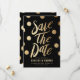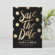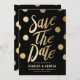 Anunciar la fecha de su boda con este personalizable guardar el anuncio de fecha. Presenta falsos puntos de Relieve metalizado dorado y tipografía moderna de fondo. Personalice este Relieve metalizado de oro falso para guardar la tarjeta de fecha añadiendo nombres, fecha, lugar y otros detalles. Esta tarjeta negra y dorada ahorran la fecha es perfecta para los bodas modernos.