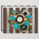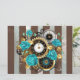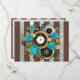 Reloj de época con estampado, adornado con joyas, manos de la hora de oro y números latinos con rosas turquesa sobre fondo marrón y rayas. Estilo Steampunk.