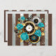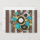 Reloj de época con estampado, adornado con joyas, manos de la hora de oro y números latinos con rosas turquesa sobre fondo marrón y rayas. Estilo Steampunk.