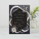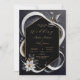 Esta imagen presenta un diseño abstracto y sofisticado. El diseño muestra un marco hexagonal negro delineado en oro, puesto sobre un fondo oscuro. Los elementos de las cintas blancas y grises que se ondean con gracia rodean el marco, creando una sensación de movimiento y elegancia. El diseño se acentúa con delicados detalles dorados y pequeñas hojas estilizadas en tonos suaves. En la esquina inferior izquierda, una gran flor blanca con un centro dorado aporta un toque de belleza orgánica a la composición. La estética general es moderna y refinada, con una combinación de colores monocromáticos que se complementa con sutiles acentos dorados. Este diseño sería perfecto para una moda y un boda contemporáneo, particularmente uno que adopte un tema minimalista o de corbata negra. Personalice el texto relativo a los nombres y detalles del boda. Puedes descargar la tarjeta en tu equipo móvil o computadora.