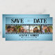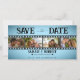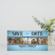 Boda retro guardar la tarjeta de fecha con el collage de fotos de tiras de película. Fondo de la viñeta azul. Personaliza con tus datos personales de bodas y fotografías de pareja recién casadas.