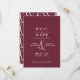 Tarjetas de boda formales de inspiración vintage para guardar la fecha con una caligrafía. Texto blanco sobre un fondo rojo oscuro que contrasta. El reverso presenta un patrón de imagen único que se puede eliminar si se desea; para una estética más minimalista, mediante la herramienta de diseño.