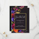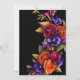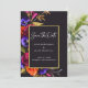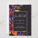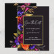 Colores hermosos y llamativos y caligrafía crean una dramática tarjeta de 'Save the Date'. Rosas de rojo borgoña y naranja quemada se mezclan con flores púrpuras. Todas ellas anidadas en follaje verde oliva oscuro. La información de la fecha de su boda está escrita en blanco y realmente destaca contra el fondo negro. Un marco rectangular dorado brillante rodea los detalles.