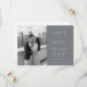 This wedding save the date features a split design with a black-and-white photograph of a couple embracing on a balcony overlooking a cityscape, paired with a modern gray panel for text. The layout is clean and balanced, using sans-serif typography to convey important details in an elegant manner. The monochromatic color palette enhances the contemporary aesthetic, creating a harmonious blend of personal sentiment and formal announcement. Perfect for couples seeking a stylish and sophisticated way to share their upcoming nuptials.