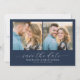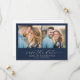 This wedding save the date card features a split layout with two intimate photos, set against a deep navy blue background that enhances the warm tones of the subjects' clothing. The design employs a contemporary and elegant style, using soft, natural lighting to create a romantic feel. A script font adds sophistication at the bottom, where customizable text fields allow for personalization. The overall mood is one of warmth and anticipation, making it perfect for sharing an upcoming celebration.