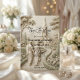 Evoke the grandeur of a historic European estate with this neo-classical illustration featuring a romantic couple in a formal cathedral garden setting.This design features a sophisticated trompe l'oeil visual effect that simulates the look of a hand-carved stone bas-relief sculpture. The monochrome palette utilizes soft ivory, cream, and warm beige tones to depict a bride and groom walking away down a winding cobblestone path, flanked by manicured hedges and tall cypress trees, leading toward a majestic Gothic cathedral. The typography hierarchy balances elegant black calligraphy for names with a vintage serif font for details, ensuring high readability against the faux-textured background. This is a flat printed image with a faux stone effect, not actual raised material.