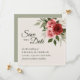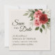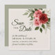 Boda elegante: salve la carta de fecha con rosas acuáticos de inspiración vintage de color rojo y rosa, complementados con follaje verde silencioso sobre un fondo beige neutro. El reverso de la tarjeta presenta un color verde sabio clásico, con un aspecto cohesivo y elegante. Todo el texto es totalmente personalizable, lo que facilita la personalización para su día especial y crear un conservador romántico y atemporal.