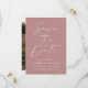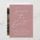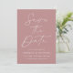 Anuncie a su próximo boda con estilo con esta moderna foto de estilo Rosa con guión moderno ¡guarde la tarjeta de fecha! El diseño presenta la función "Save the Date" que se muestra en una caligrafía blanca a la moda con un fondo polvoriento en rosa. Personalice el minimalista guardar la fecha con sus nombres, fecha de boda, ubicación y sitio web del boda. La fecha de guardar se invierte para mostrar la foto de compromiso vertical de sangrado completo. El rosa polvoriento de la moda ahorra la fecha la elección perfecta para bodas modernos.