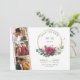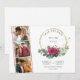 Boda Rosa Roja salva la fecha con 3 fotos personalizados, rosas rojas acuarelas, hojas de eucalipto y un marco redondo geométrico dorado. La plantilla está lista para que añada los detalles de la fecha del boda del frente, así como las iniciales del monograma de novia y novio en la parte posterior. Tema floral botánico con tipografía simple y elegancia moderna.