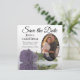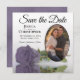 Estas hermosas florales modernas salvan las tarjetas de cita son la manera perfecta de hacer que sus amigos y familia sepan de su próximo boda. Presentan un diseño elegante con un único rosa de color púrpura o lavanda de tallo largo que refleja en un estanque de agua con olas y ondas con una foto en forma ovalada sobre un fondo blanco clásico. La leyenda dice Guardar la fecha con espacio para los nombres, la fecha y la ubicación. La parte posterior es de color gris morado.