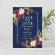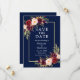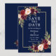 Elegante acuarela Borgoña Floral Save The Date Engagement Tarjeta de Invitación Boda incluye rosas de color burdeos, rosas rosas rosas rosas, rosas rojas y vegetación botánica en un marco dorado. Fondo Azul.