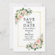 Tarjeta de anuncio de boda para guardar la fecha con rosas de tono rosa y flores blancas en acuarela con vegetación botánica en un marco dorado. Parte trasera con foto.