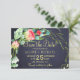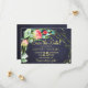 Moda bodas botánicas modernas salven la plantilla de la tarjeta de fecha con rosas rojas rosa y rojo coral de color azul verde azulado y hojas doradas sobre fondo de pizarra azul marino oscuro de medianoche. Ideal para una primavera rústica de moda floral, verano o otoño jardín elegante boda elegante.