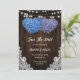 Romantic rustic purple and blue floral wedding save the date card featuring hydrangea flowers against a barn wood background adorned with white floral lace and string lights.