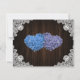 Romantic rustic purple and blue floral wedding photo save the date card featuring elegant floral lace and string lights against a barn wood background. Two floral hearts and white floral lace on a rustic wood background at the back.