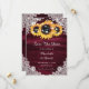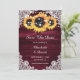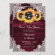 Boda de Borgoña y girasol salvan las tarjetas de cita con girasoles y encaje floral blanco contra un fondo rústico de madera. Elementos coincidentes disponibles.