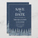 A rustic save the date card for your winter wedding with a nighttime snow covered forest in navy blue and white.