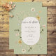 Esta boda, salvo la tarjeta de fecha, presenta un delicado fondo verde sabio, que exuda un sentido de sofisticación y riqueza. El suave tono verde sabio crea un entorno cautivador que marca el tono para una celebración memorable. En el centro de la invitación, destaca un marco de texto ovalado, que proporciona un punto focal elegante. El marco está bellamente diseñado, exuberando una sensación de refinamiento y elegancia. Su forma añade un toque de singularidad, captando la atención de los destinatarios. Alrededor del marco de texto, las flores silvestres de acuarela delicadas y rústicas están dispuestas artísticamente. Estas flores encantadoras, decoradas en tonos suaves, evocan una sensación de belleza natural y tranquilidad. La acuarela les da un aspecto sutil y etéreo, realzando el ambiente romántico general de la invitación. La combinación del fondo verde sabio, el marco oval de texto y las flores silvestres de acuarela rústicas crean una impresionante invitación a la boda que exuda elegancia y un toque de fantasía. Establece el escenario para una celebración romántica llena de belleza natural y momentos sentidos. Creado por Simply Farmhouse Press, forma parte de la suite rústica boda Frame Sage Green.