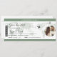Elegante boleto boda de pases de embarque verde salado, un retrato de la pareja comprometida, un avión con un rastro de bucle y un personalizable que guarda la plantilla de fecha. Recuerde editar el texto de la parte posterior del monograma. Inicio de sesión