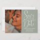Esta elegante boda de guion verde sabio ahorra la invitación de fecha puede ser personalizada con sus 2 fotos especiales e información del día de la boda y el código QR del sitio web boda. Diseñado por Thisisnotme©