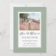 Sage Green Save The Date Engagement Photo boda card design incluye un hermoso borde de moda en verde sabio que incluye un elegante borde blanco pequeño. La caligrafía y el guión son de color gris carbón sobre fondo blanco. Una plantilla moderna para fecha y año complementa el diseño único de caligrafía. [NOTA: La visualización de la fecha de boda como se muestra, utiliza la barra vertical o la línea que se encuentra encima de la \ en un teclado o en su dispositivo inteligente con los caracteres especiales. También puedes personalizar con cualquier otro personaje de tu elección.] Personalizar con tu foto de compromiso favorita para anunciar tu gran día! Otros diseños disponibles en esta suite. (Para la mejor ubicación de la imagen, utilice una herramienta de edición de fotos para centrar y recortar ANTES de subir al sitio web de Zazzle.) Envíe un correo electrónico a invitationsuites@gmail.com con preguntas o solicitudes de personalizados.