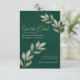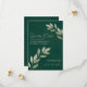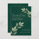 Estas elegantes bodas, salvo las tarjetas de fecha, presentan un diseño rústico y moderno con brotes de hojas de color verde salado que entran por ambos lados de la carta sobre un fondo verde esmeralda de mármol. La tipografía es única y elegante, con texto justificado a la izquierda y a la derecha. Sencillas y elegantes, estas tarjetas son la manera perfecta de hacer que sus amigos y familiares sepan de su próximo boda.