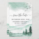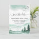 Boda verde Rustic Forest Watercolor - Guarda la tarjeta de fecha en el fondo blanco - incluye hermosa y elegante tipografía de escritura con árboles modernos, montañas y pájaros para la celebración especial del Día de la Boda.