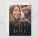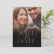 Moderno y minimalista, foto de save our date tarjeta de save the date. El diseño presenta una foto completa moderna para mostrar tu propia foto especial. "Save our Date" se muestra en un diseño de tipografía de falso foil de rosa dorada moderna con nombres y nueva fecha de boda. La superposición de fotos de gradiente negro añade un aspecto lujoso.