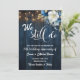 Un elegante Aniversario de la Boda Salvar la Tarjeta de Fecha con elegante caligrafía completada por maravillosa madera azul, luces de cuerda de jardín y floral azul blanco con purpurina dorado. Puede personalizar esta tarjeta con los detalles de su aniversario previo al Boda.