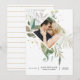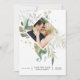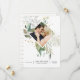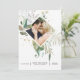 Tarjeta de aviso de boda con acuarela floral verde y flores silvestres de color rosa claro en tonos pastel con marco geométrico dorado personalizable a los detalles de su evento.